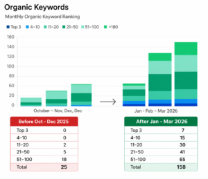 On-page SEO & content structuring: Optimized pages with structured metadata, clear hierarchies, and intent-aligned content. Ensured accurate indexing and improved rankings of key service pages on SERPs.
